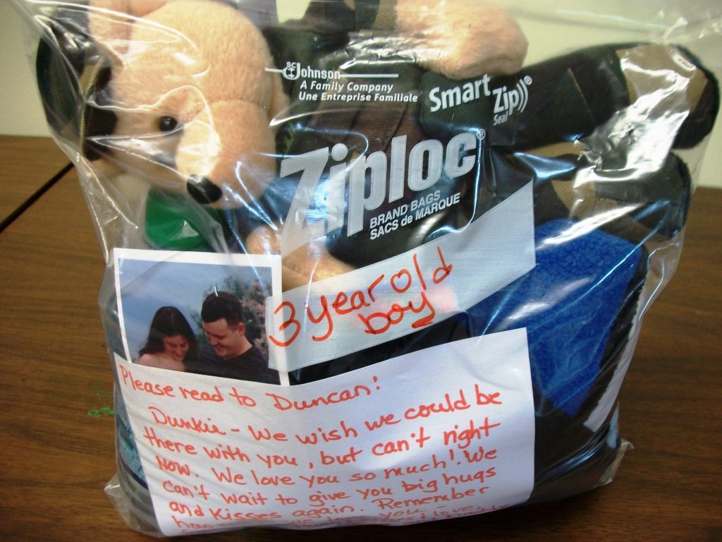 We are glad you have this bag of special things. While you wait, try to be cheerful and cooperative. We are thinking of you and we are doing everything we can to join you. We love you and hope we are all together soon.